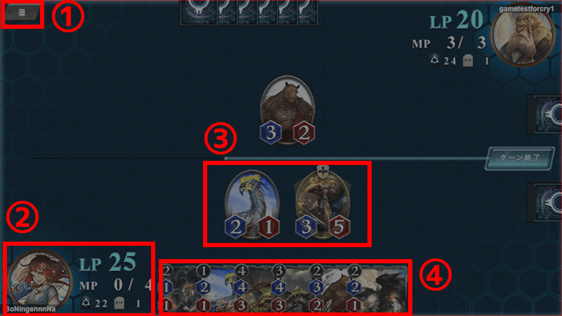 ②リーダー情報 プレイヤー名、使用リーダー、現在のLP(ライフポイント)、MP(マナポイント)、残りデッキ枚数、墓地枚数を確認することができます。