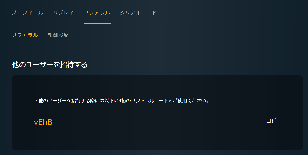 「ユーザー」＞「リファラル」の順でタブをクリックすると、他のユーザーを招待するためのリファラルコードを確認できます。